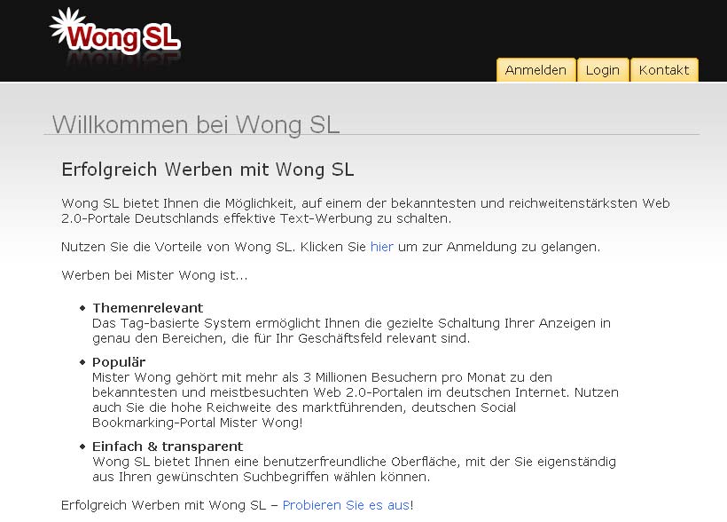 WongSL ist der Anzeigenbereich zur Social Bookmark Plattform Mr.Wong und bietet die Möglichkeit auf diesem Portal Werbung zu schalten. WongSL ist dabei noch sehr neu – der Dienst existiert erst seit Ende 2007 – entsprechend gering sind die Erfahrungswerte mit diesem Dienst.