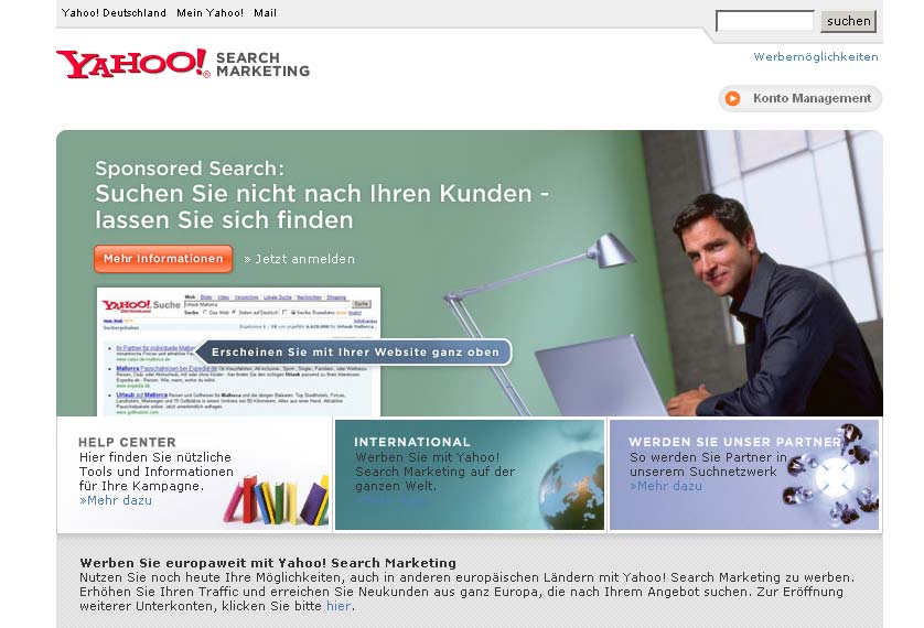 Yahoo! Search Marketing ist der Anzeigenbereich für die Yahho! Suche und die über Yahoo vermarkteten Seiten. Wie bei Adwords auch steht hier neben den bezahlten Suchmaschineneinträgen auch die Möglichkeit zur Verfügung auf Contentseiten zu werben.